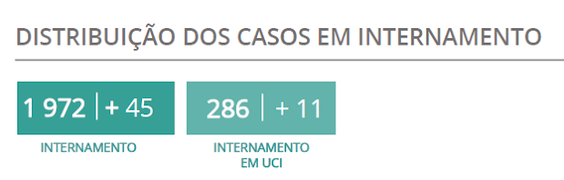 Estão internados em unidades hospitalares do país: 1.972 (+45) doentes, dos quais 286 (+11) estão em unidades de cuidados intensivos, dados que revelam uma forte subida de doentes a precisar de atenções dos profissionais de saúde diferenciados e do número de pacientes a necessitar de cuidados mais específicos.Nota de redação: Todos os dados reportados, são facultados na página da DGS, ou em páginas dos municípios, reservando-se aos mesmos os seus direitos e passagem de informação no blogue.